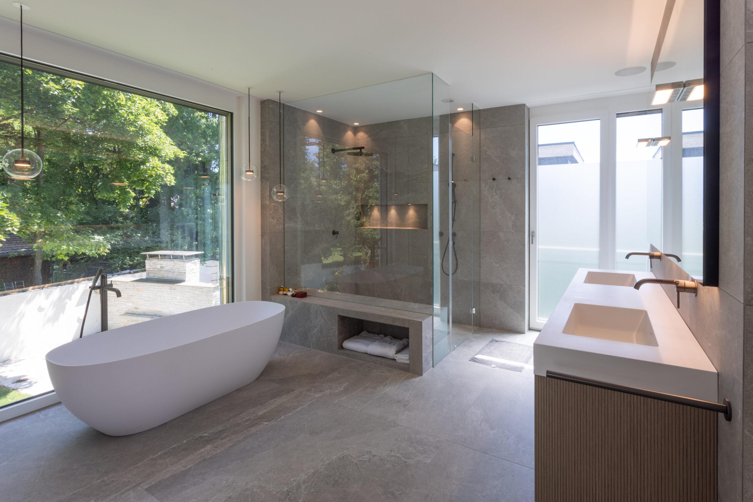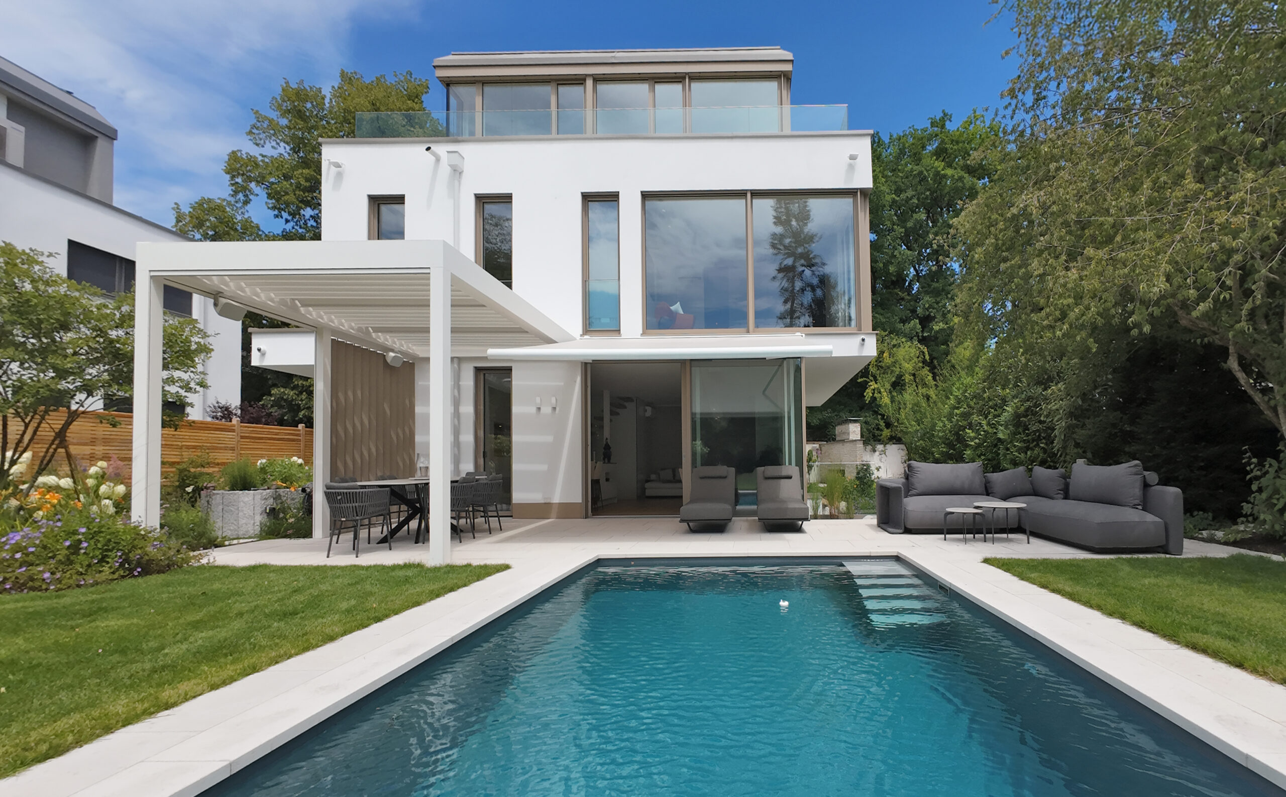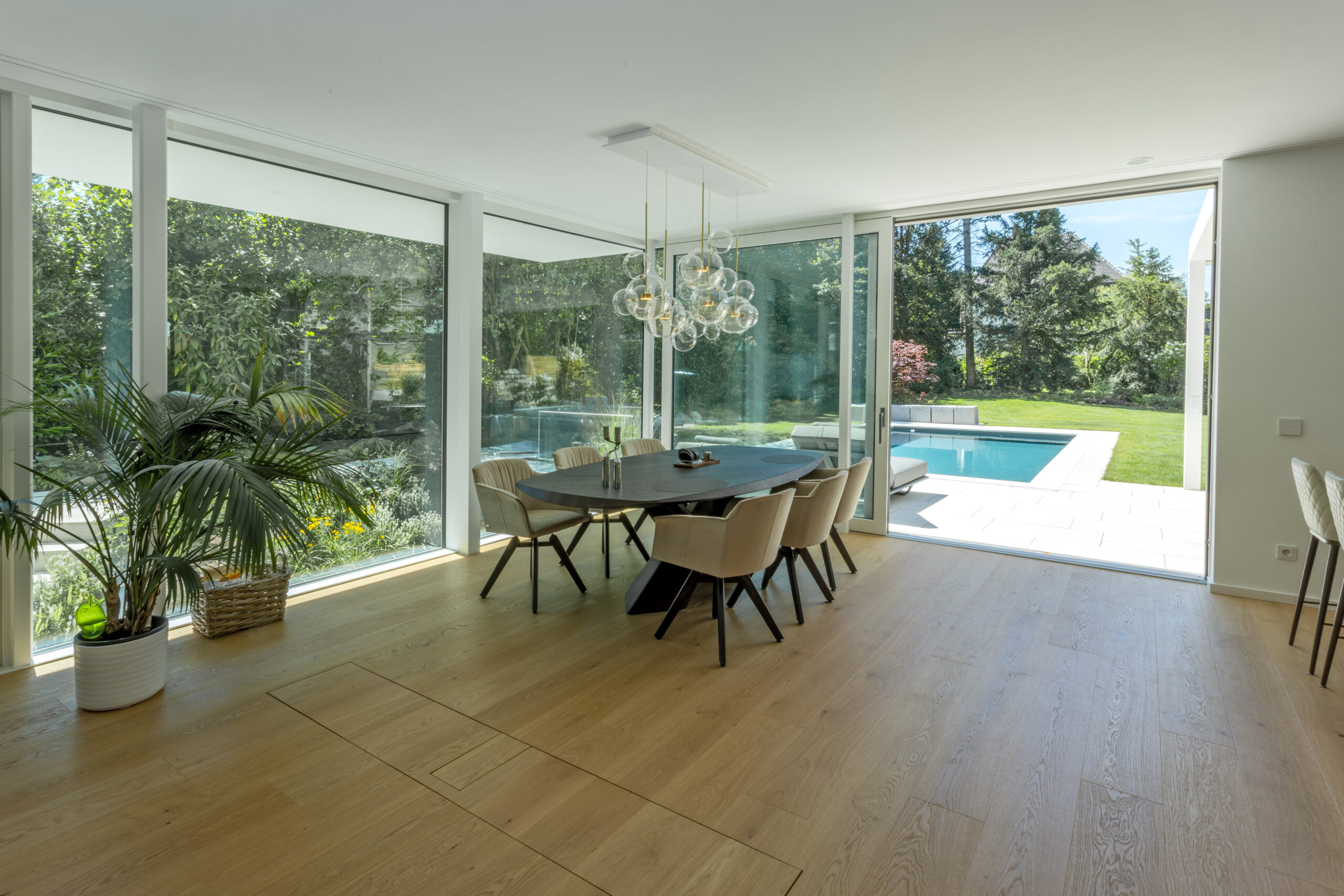 Exklusive Villa mit rund 285 m² Wohnfläche auf einem 1.300 m² großen Grundstück. Klare Linien, großzügige Glasfronten und lichtdurchflutete Räume prägen das Design. Highlights sind der private Wellnessbereich mit Sauna, luxuriöse Bäder sowie der offene Wohn- und Essbereich mit Blick auf Pool und Garten. Ein modernes Zuhause, das Eleganz und höchsten Wohnkomfort verbindet.